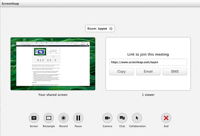 You and your users will be able to take advantage of all of the benefits of Screenleap’s live-collaboration platform directly from your website without needing to use another app or online service—all you and your users need is a web browser. You can use our integration feature to streamline your sales process with your prospects, provide your customers with more effective support, collaborate more easily with external users, host your online classes directly from your website, and more.
