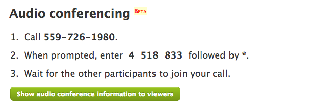You can share your the conference call information with your viewers by clicking the Show audio conference information to viewers button. If you do so, your viewers will be shown the audio conferencing information when they connect. They simply need to dial the number that are shown to them and enter the 7-digit access code followed by the # button.