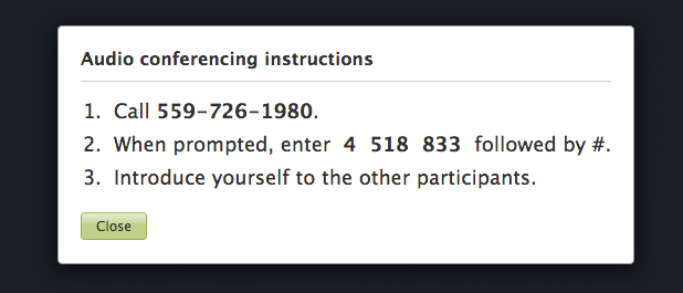 To use audio conferencing, simply click the Show instructions link underneath the Audio conferencing heading that is shown when your screen is shared. You will be shown a phone number along with a 7-digit access code. To start a conference call, simply call the number listed and enter your 7-digit code followed by the * button. Conference call hosts can access additional commands during their calls. Please take a look at the FAQ for a complete list of available host commands.