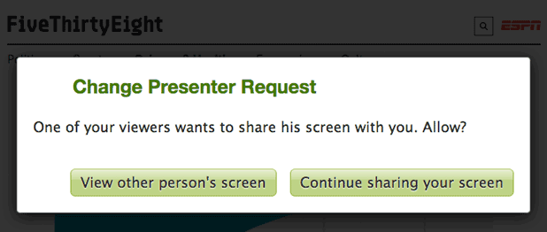 If you say yes, the viewer will start sharing his/her screen and you will be redirected to the viewer page so that you will be able to see his/her screen. Viewers who have not previously shared using Screenleap will be first prompted to download and install the presenter app.
