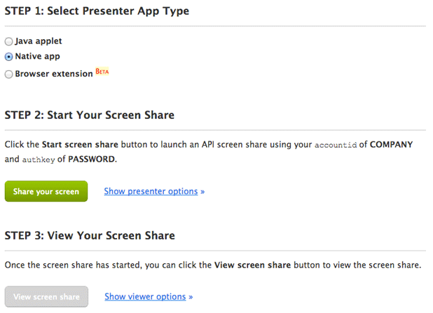 We are excited to share that the installation-free sharing option that has been available on the Screenleap site is now available in our API. You will now be able to offer your users the ability to start share sessions from your website and allow them to interact with other users through screen sharing, 2-way audio conferencing, and video conferencing—all without needing anyone to install any software. All they need is a modern web browser.